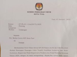 pemberitahuan sidang penetapan ini dikeluarkan KPU Tual melalui surat undangan tertangal 7 Januari 2025.