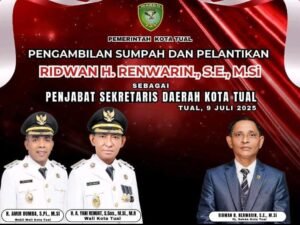 “Pemerintah Kota Tual mengundang dengan hormat bapak/ibu/saudara/i pada acara pengambilan Sumpah dna pelantikan bapak Ridwan H. Renwarin, S. E, M. Si sebagai Penjabat Seketaris Daerah Kota Tual, ” demikian kutipan undangan Elektronik Pemkot Tual yang beredar di whataspp, Selasa (8/7/2025).