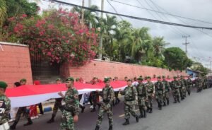 Terlihat, personil TNI/Polri mengarak Bendera Merah Putih sepanjang 80 meter diiringi dentuman drum band dan diarak keliling Kota Tual.