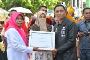 Penjabat Sekretaris Daerah Kota Tual Ridwan H Renwarin menyerahkan piagam penghargaan kepada salah satu perwakilan guru di Kota Tual. (Foto; istimewa).